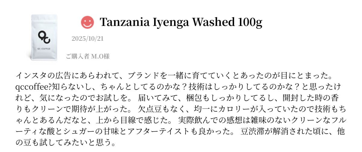 「派手じゃないな。」そう思ったのが最初の印象でした。 でも飲み終わったあと、気づきました。「これ、好きだな。」 強烈な個性ではなく、毎日飲みたくなる心地よさ。忙しい日でも、少し気持ちを整えてくれる一杯です。 焙煎:Light ■ ■ ■ □ □ Dark 酸味:Low ■ ■ ■ □ □ High 香り:Low ■ ■ ■ □ □ High 甘味:Low ■ ■ ■ □ □ High 苦味:Low ■ ■ ■ □ □ High コク:Low ■ ■ ■ □ □ High フレーバー:いちご、緑茶、メロン、クリーン おすすめのペアリング レアチーズケーキ、いちごのスイーツ、ホワイトチョコレートなど、やさしい甘さのデザートとよく合います。