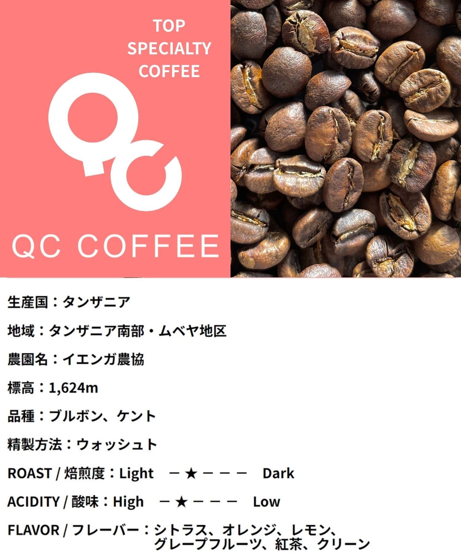 タンザニアでは北部が従来のスペシャルティコーヒー産地でしたが、近年は南部が台頭し、特にムベヤ地区イエンガ農協が大きな成果をあげています。ブルボン種の栽培や精選設備の整備により品質が向上し、2019年の品評会では上位を獲得。女性農家の参加も増え、他地域には少ない特色となっています。フレーバーは華やかな香りと柑橘系のフルーティな酸味、爽やかな甘みが特徴で、Qグレード86.83点という高評価を得ており、タンザニアを代表する高級スペシャルティコーヒーとなっています。